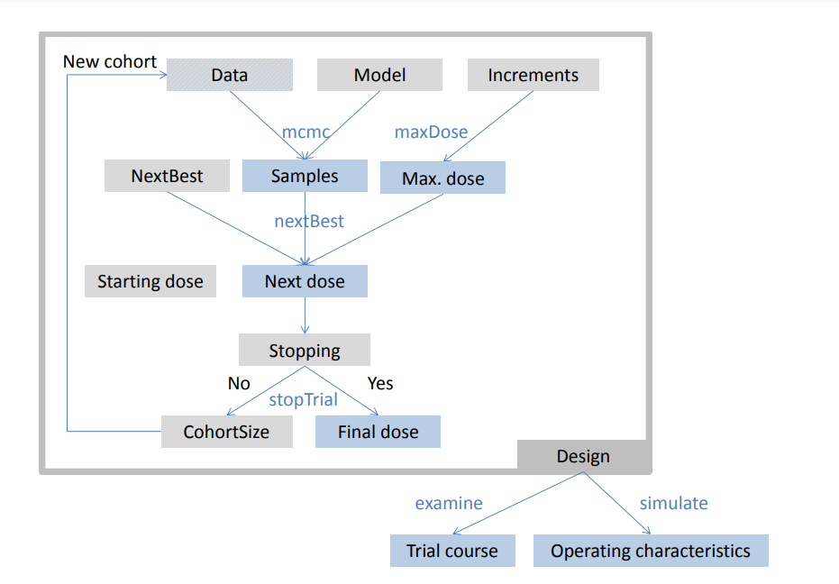 crmPack provides a highly flexible framework for the design and analysis of dose escalation trials. This schematic illustrates the framework’s key components and their interactions: